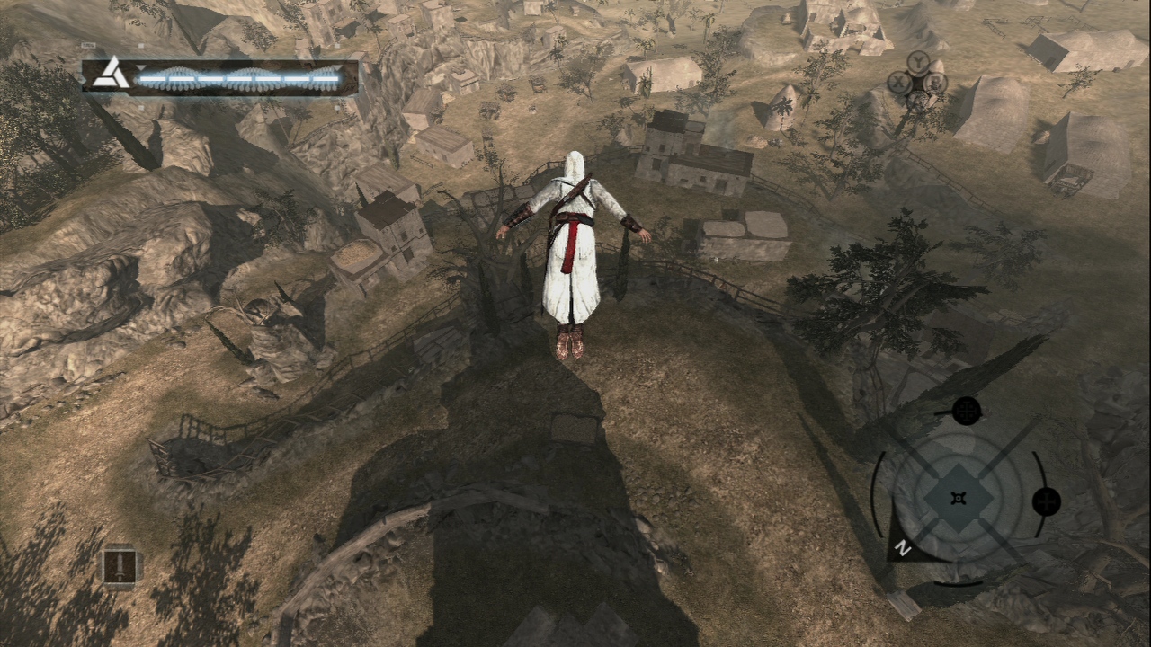 タケチーアサシンは出てくる敵は全部倒すタイプなので、走って逃げたりしません。また今回からは新しくカウンターをマスターしたので、逃げる必要が有りません。このゲームは今の所、追ってくる警備兵をその場で始末してしまえば堂々と歩いて帰れます。逃げ惑う人々が「警備兵を呼んでくれ~!」とか言ってるけど、既に全員床で寝ています。まだ生きてる警備兵は民衆に紛れて一緒に逃げてますし。アサシンは刀剥き出しのまま歩いて立ち去るので、その姿はFF7のセフィロスの様に思えます。と言うかセフィロスのニブルヘイムの事件を意識してやってます。ただ主人公のアルタイルは正義のアサシンなのでゲーム的に倒してオッケーな警備兵のみ倒しており、民間人には一切手出しをしません。あとかなり前にアサシンの記事を書いた時はアサシンバンジーの画像が撮れなかったので、今日はハイビジョンVerを撮って来ました。バンジーは何度やっても面白い。(*'-')ノ