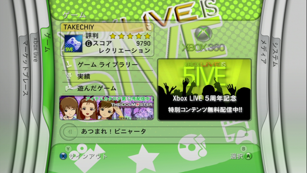 今日は仕事で帰るのが遅くなる予定なのでサクっと朝書いちゃいます。デュエイン卿のクエが後少しなのでやりたいのと、フレンドさんと約束が有るので手抜きです。一昨日くらいからXboxLive5周年記念とやらで、”5IVE”とかいう広告がダッシュボードに出てます。パッと見