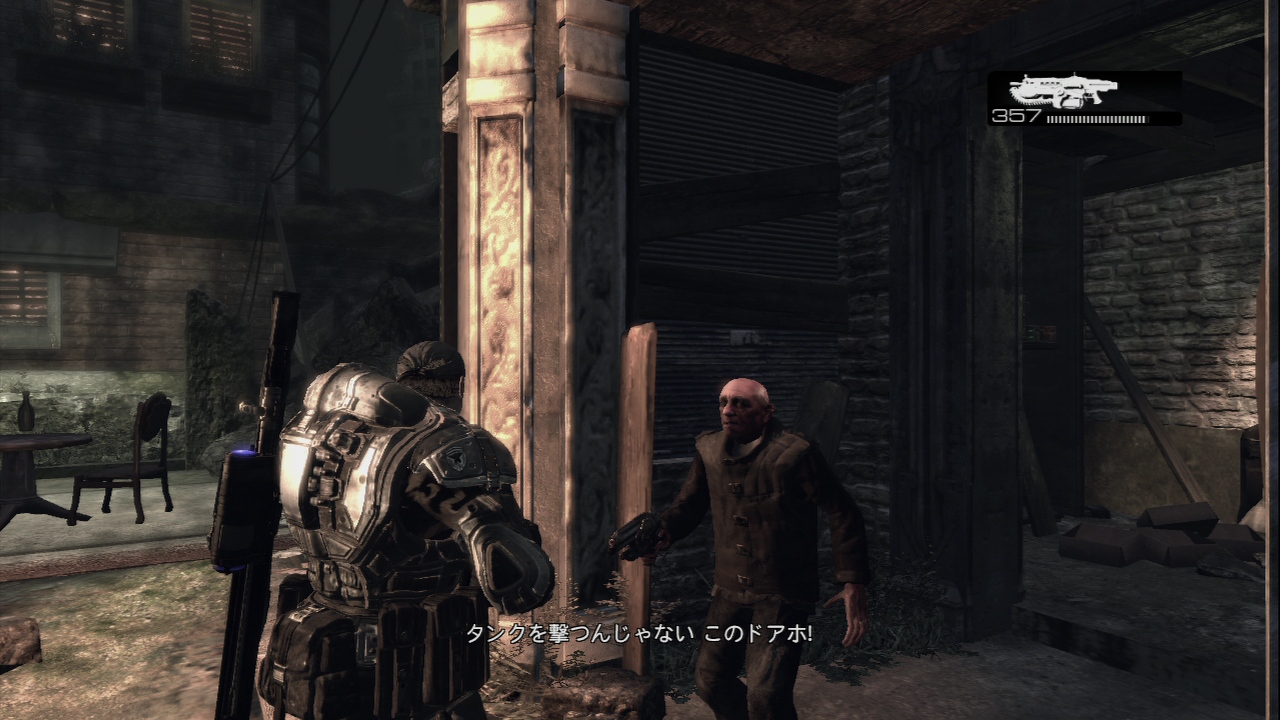 以前ベルセルクの画像を撮った時も思いましたが、いつも居る筈のフレンドさんの代わりが無言のドムだと寂しいですねぇ。一人でやっても物足りないので、ギアーズで一番お気に入りのじいさんの画像を撮って来ました。このじいさんは「左じゃボケ!」とか「タンクを撃つんじゃない このドアホ!」物凄く口が悪いのでインパクト有りすぎです。いつもは疑問に思いつつもフレンドさんに迷惑になるのでやりませんでしたが、今日は試しにタンクを撃ちまくってみました。するとタンクは大爆発して主人公のマーカスさんは、
