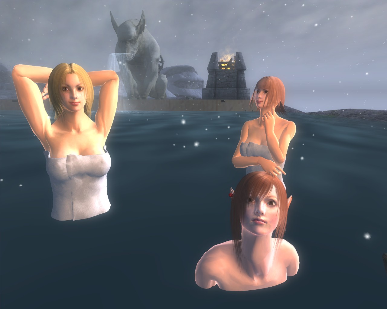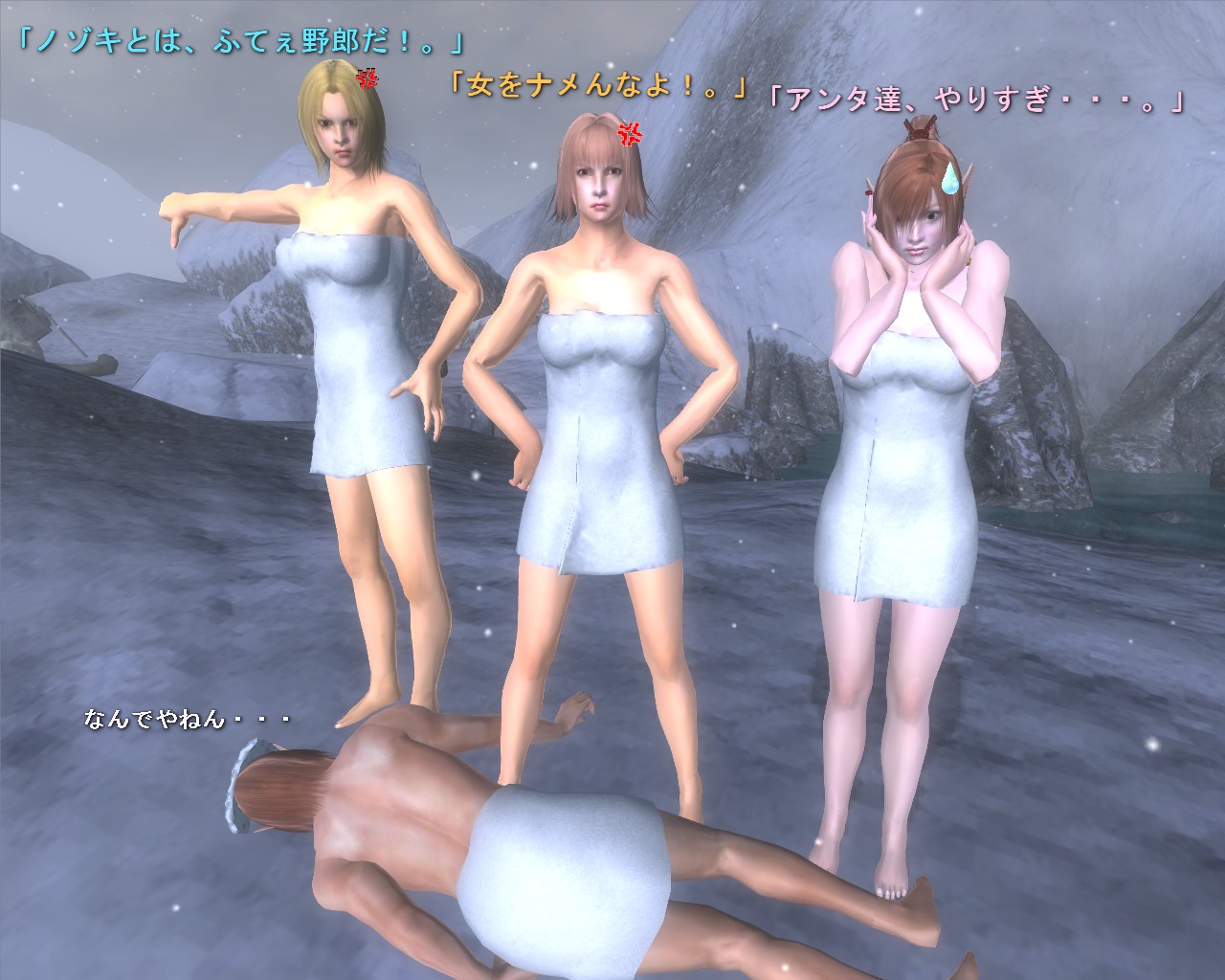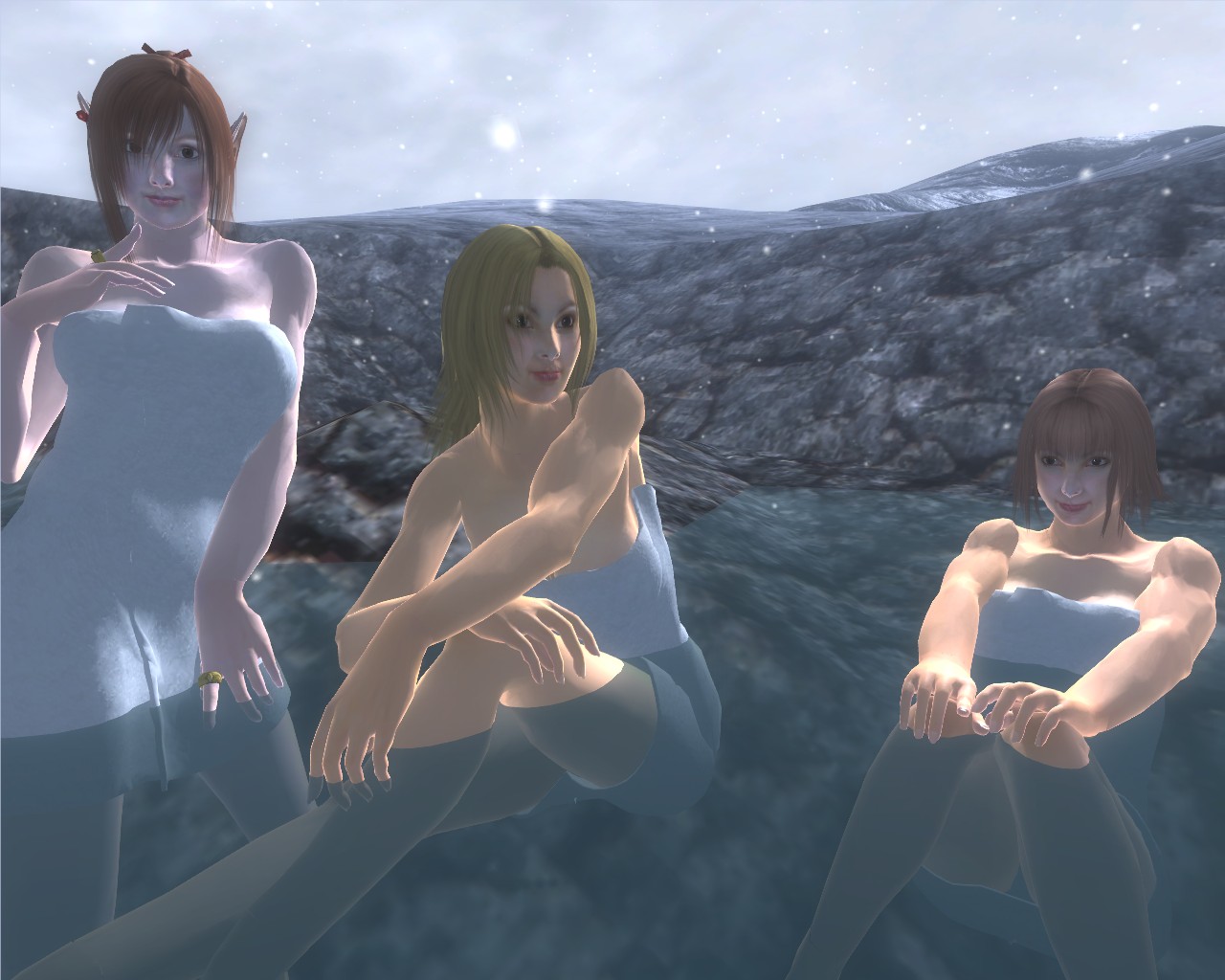 でした。混浴での撮影をしてるとき、アニキ外して女子オンリーの方が画になりそうに思えました。急遽自宅で待機してたシエラとメイを呼び寄せて、アニキは撮影の邪魔なので“ 休め ” のコマンドで家に帰らせようとしました。(撮影中に後ろで待機させているキャラがフレームに入って邪魔な事は良く有ります。) 普通なら自宅の方角へ歩いて消えて行くはずなのに、何故か腕組みしてその場から動こうとしません。何度かコマンド入れなおしても、全くいう事を聞きません。まるで出番の終わった若手俳優が、プロデューサーに「帰れ」と言われても、その後に行われる