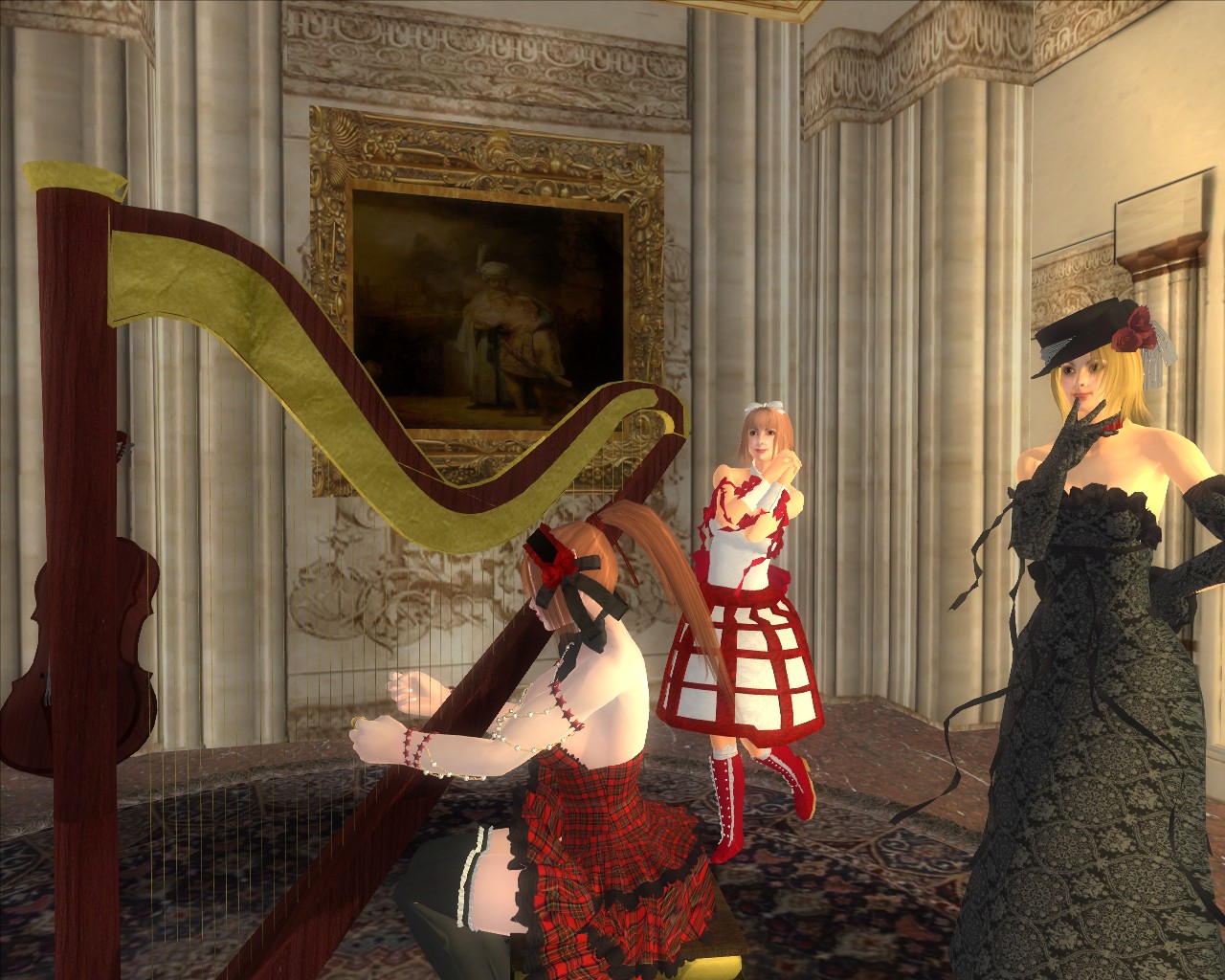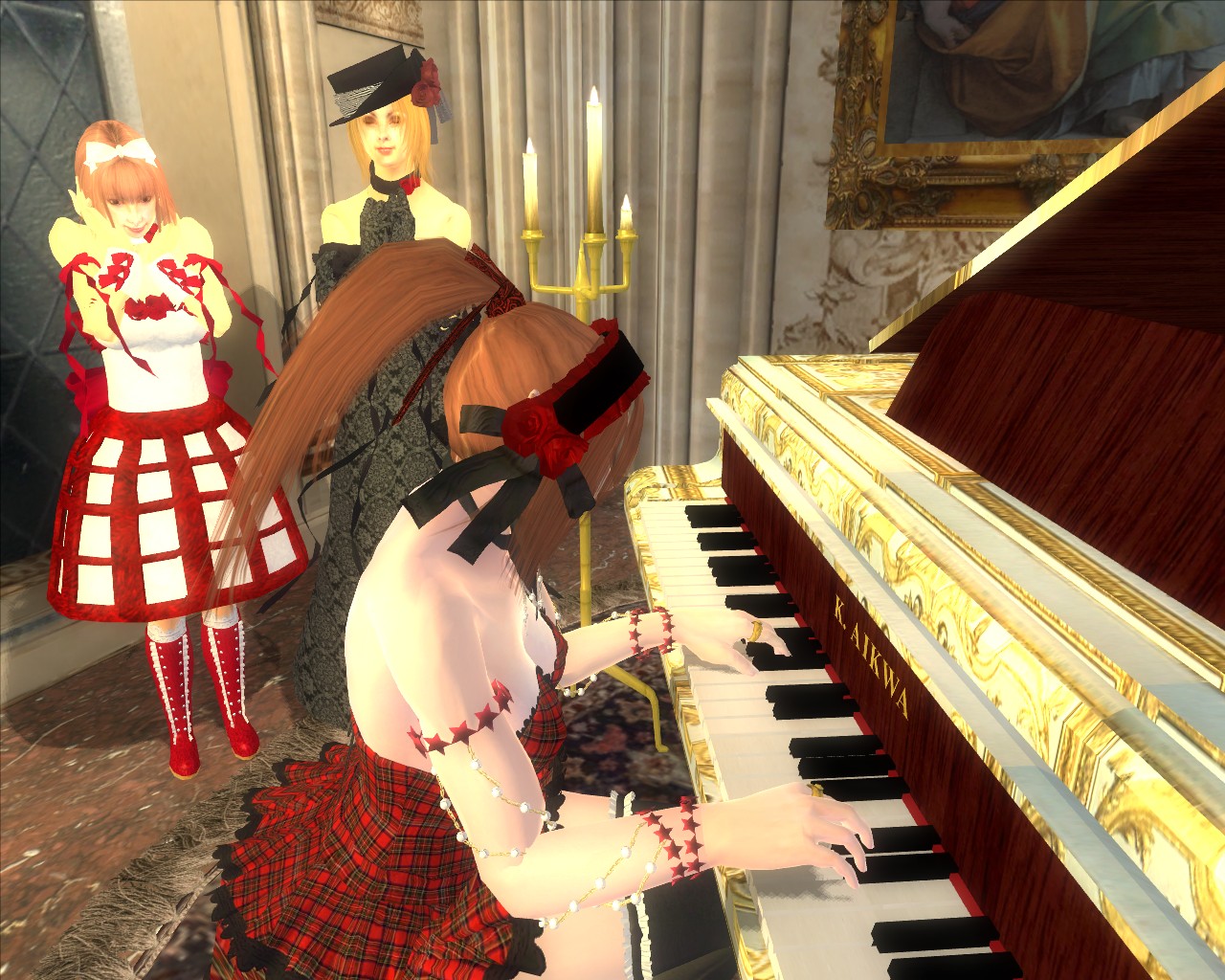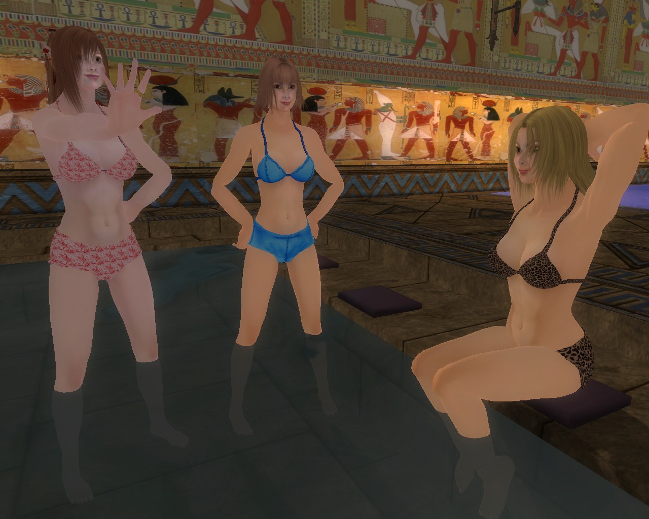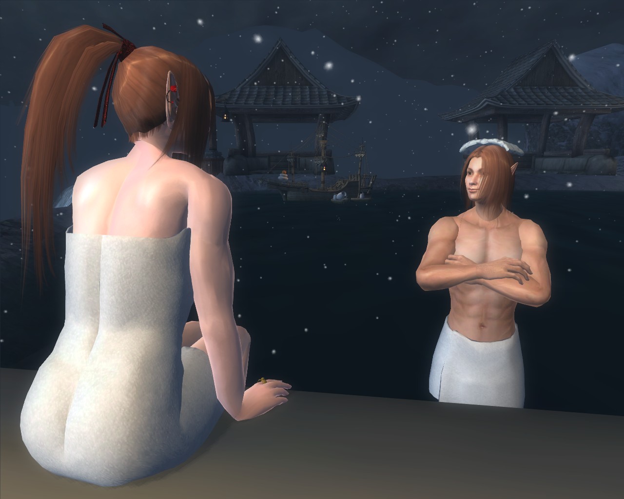 でした。混浴での撮影をしてるとき、アニキ外して女子オンリーの方が画になりそうに思えました。急遽自宅で待機してたシエラとメイを呼び寄せて、アニキは撮影の邪魔なので“ 休め ” のコマンドで家に帰らせようとしました。(撮影中に後ろで待機させているキャラがフレームに入って邪魔な事は良く有ります。) 普通なら自宅の方角へ歩いて消えて行くはずなのに、何故か腕組みしてその場から動こうとしません。何度かコマンド入れなおしても、全くいう事を聞きません。まるで出番の終わった若手俳優が、プロデューサーに「帰れ」と言われても、その後に行われる