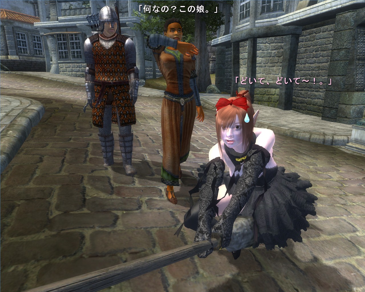 アンヴィルの街でホウキを手に入れたアリシアさん。人の迷惑も省みずに、街中でホウキを乗る練習を始めました。通行中のオバサンや衛兵達も、突然の出来事に驚いています。街中ではキケンなので、衛兵に追い出されてしまいました。
