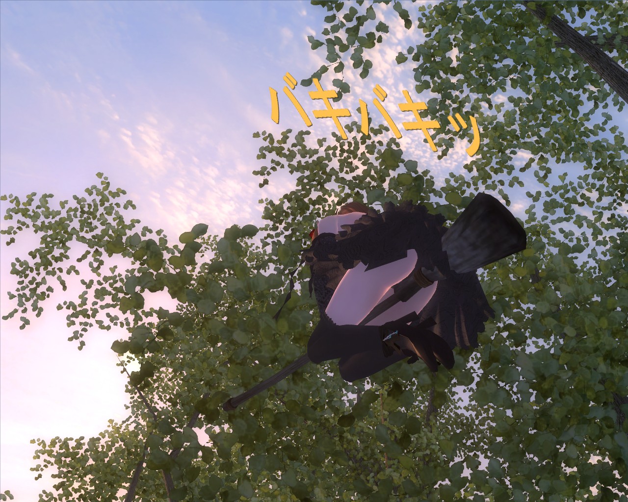 仕方なくアンヴィルの外で練習を再開したアリシアさん。中々操作が難しく、本物のキキちゃん同様にヘタクソです。少し飛んでは木にぶつかってしまい、あまり高くは飛べてないようです。