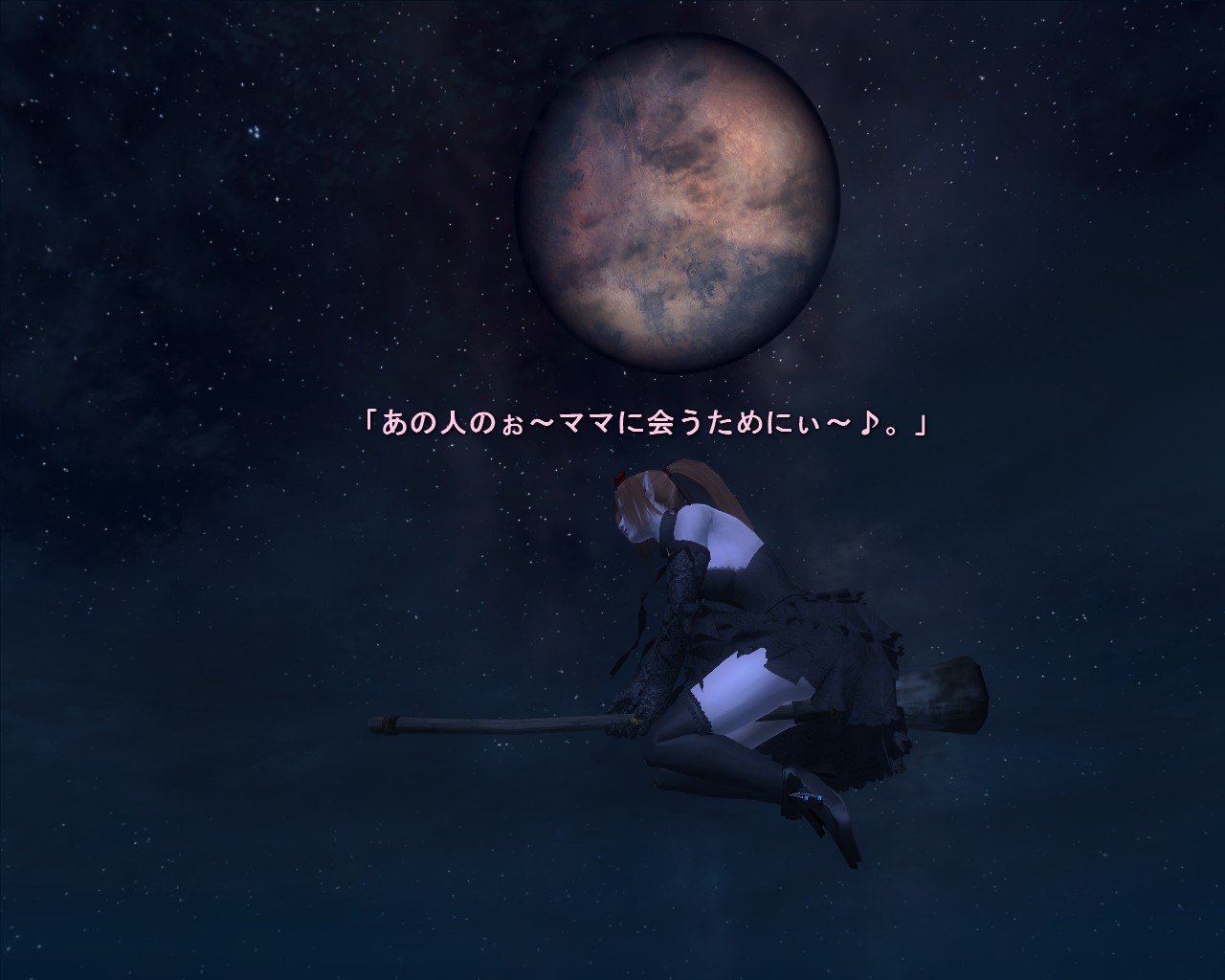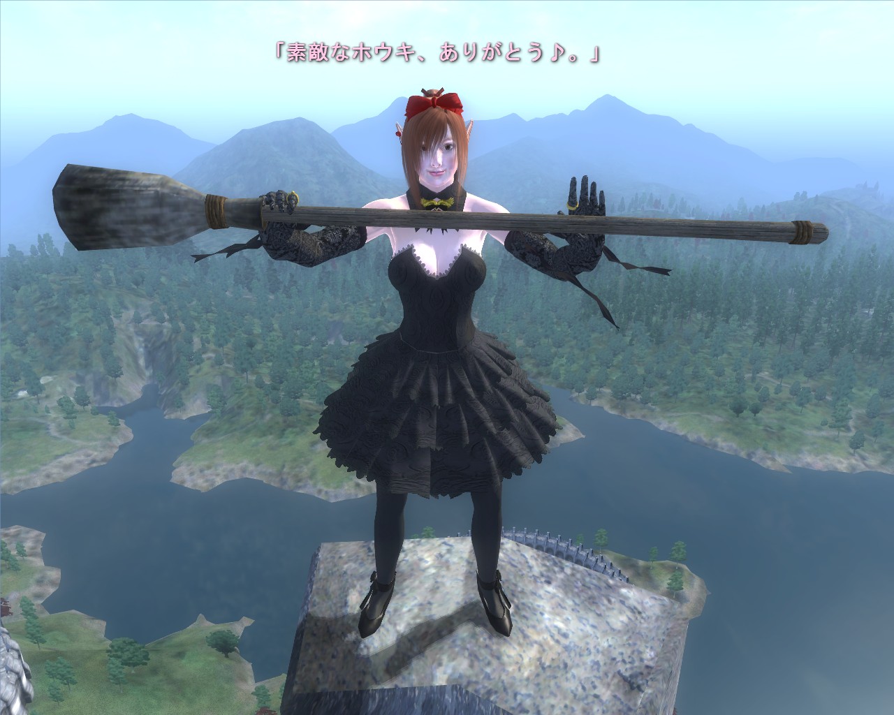 念願の魔女のホウキをゲットして浮かれるアリシアさん。衣装もキキちゃんを意識して、黒いドレスに赤いリボンの魔女ルックでキメています。